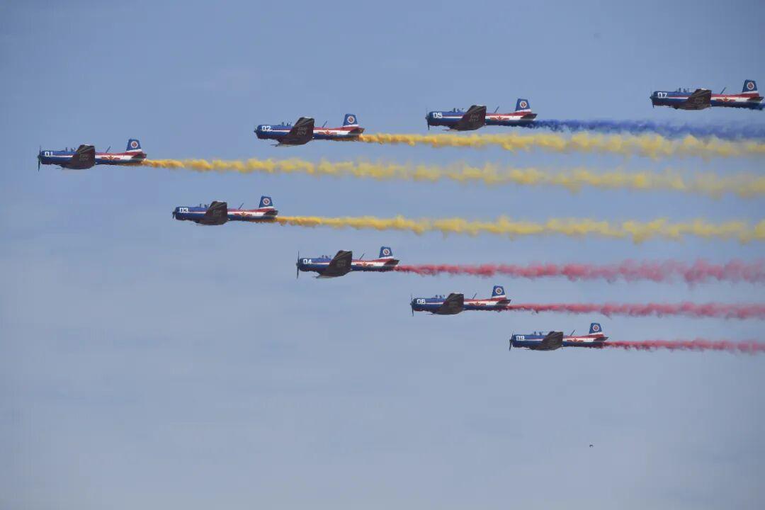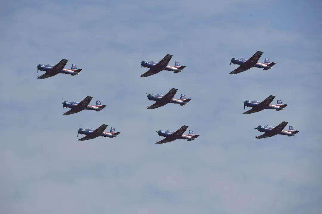 作为飞行员的“启蒙导师”,初教-6见证了无数飞行员的成长,是空军航空大学“天之翼”飞行表演队的“好搭档”。这次“天之翼”增加了新的动作,如“九机鹰队”、“四机跟踪盘旋”、“九机威龙”队形通场等,彰显了初教-6稳定、可靠的飞行性能。